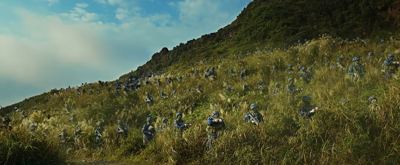 片中呈現解放軍登入台灣的畫面。圖源:截圖自【零日攻擊 ZERO DAY】 官方完整版前導片據介紹,這部影集共10集,由十位導演參與製作,耗資2.3億台幣,自今年三月開拍,預計十一月底殺青,將於2025年正式播出。出資者包含文化部、曹興誠、高雄市政府、中華電信等,大多和政府單位有關,且獲得國防部高度配合。片中劇情設定迎合民進黨台獨意識形態,架空兩岸因歷史遺留未解而形成分斷體制的問題,也無視大陸因反制台獨早已展開圍島軍演的現實,將「台海戰爭」詮釋為解放軍「入侵」台灣,並以如何召喚「保家衛國」意識,成為片中探討的焦點。