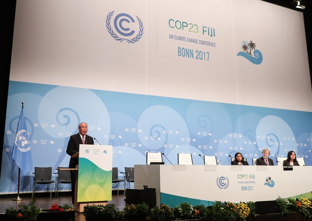 2017年11月16日,解振華(左)在聯合國波恩氣候變化大會高級別會議上發表講話。(圖片來源:新華社)