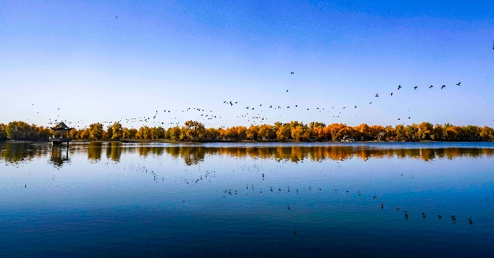 在位於塔里木河下游新疆巴音郭楞蒙古自治州輪台縣的一處胡楊林裡,一群鳥從水面上飛過。(圖片來源:新華社,趙戈攝)與2000年相比,新疆塔里木河流域每年消耗的水資源總量從194.8億立方公尺下降到最近3年的平均值152.7億立方公尺。換言之,塔里木河流域1年的節水總量相當於26座天山天池的蓄水量(以1.6億立方公尺計算)。