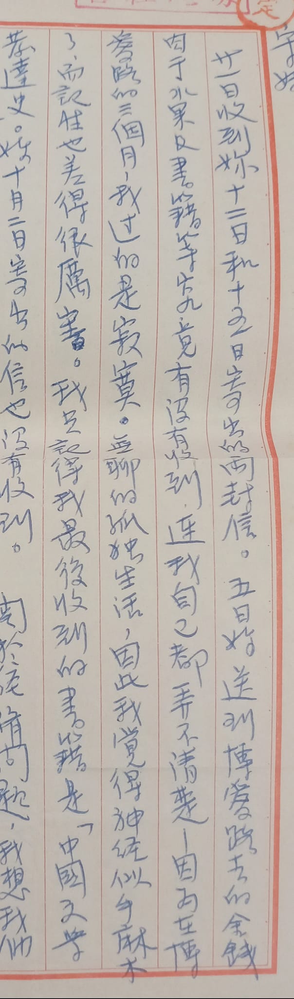 在10月24日寄出的信裡爸爸則說,不清楚有沒有收到媽媽10月5日送到博愛路保安處的錢和肉乾等,「因為在博愛路的三個月,我過的是寂寞、無聊的孤獨生活,因此我覺得神經似乎麻木了,而記性也差得很厲害」。