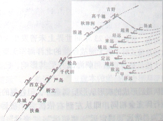 黃海海戰中日雙方艦隊砲火決戰時之陣形。取自《中日甲午戰爭全史》。
