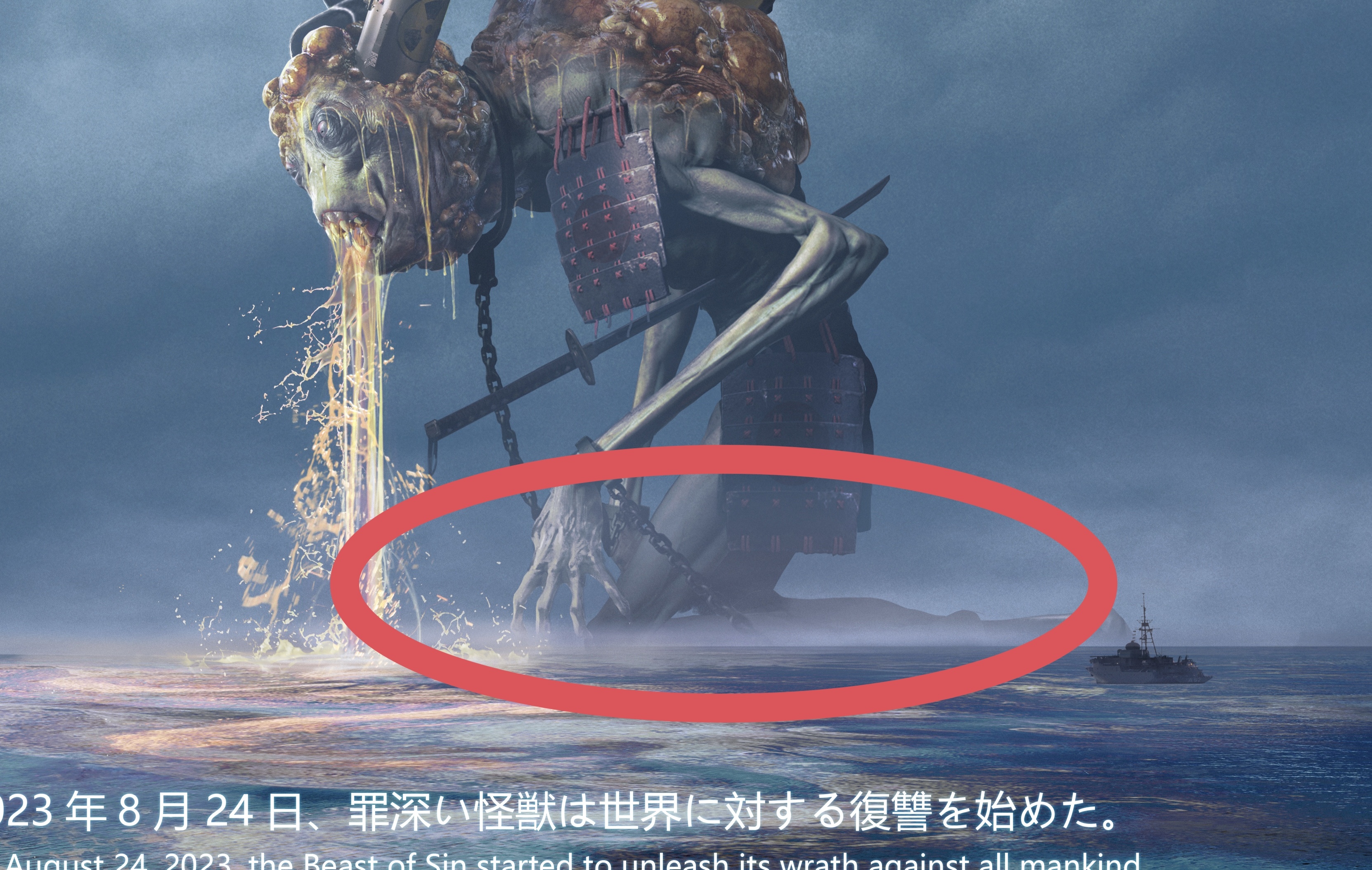 這幅作品描繪了一頭變異的惡獸跪在海洋面上,圖下方標注一句日文和英文的文字:「2023年8月24日,罪獸開始了對全世界的報復」(罪深い怪獣は世界に対する復讐を始めた)。而在這幅畫中,暗藏著許多細節。