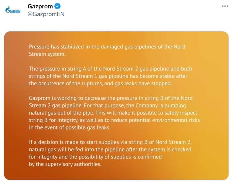 目前,遭到損壞的北溪3條管線已經停止漏氣,管內氣壓穩定。此外,俄氣公司仍在抽取北溪二號B線中的天然氣,以便降低管內氣壓。俄氣表示,他們採取的措施可以安全檢測這條支線是否完好無損,同時可以降低事故區域的潛在生態風險。