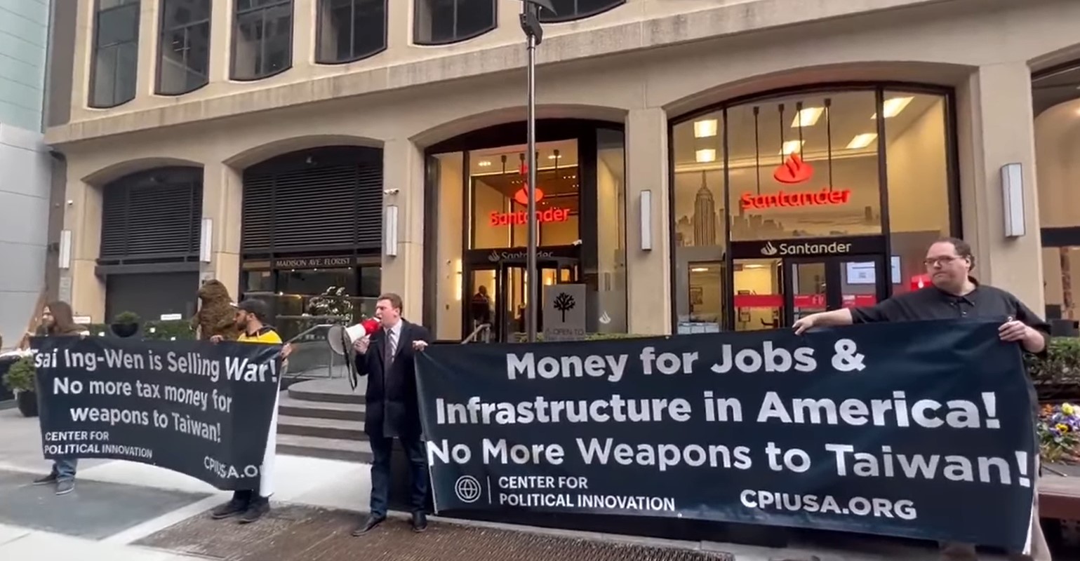 根據網路短視頻顯示,一身穿西裝手拿大聲公的男子,在蔡英文抵達飯店時不斷大喊「中國不是我們的敵人!」「滾出我們的國家!」「不要在這裡兜售戰爭!」據悉,此團體是美國左翼團體「政治創新中心」(Center for Political Innovation),西裝男子與其同伴,舉著黑底白字巨大布條,上面寫著「把錢用在美國的工作職缺與基礎建設上!不要再提供軍武給台灣!」以及「蔡英文正兜售戰爭!不要再把稅金用在提供台灣武器!」