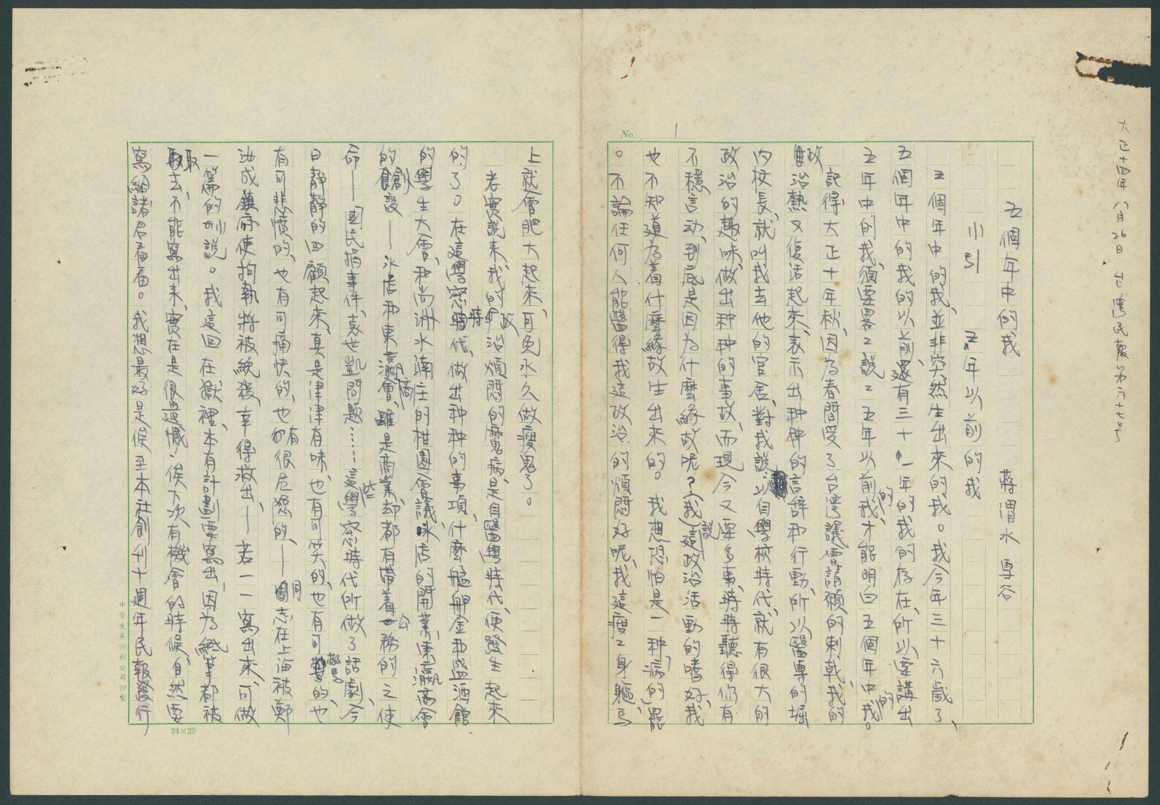 〈五個年中的我〉手稿。圖源:台灣清華大學圖書館在文化協會成立大會上,同為發起人的周桃源和吳海水醫師的致辭也都指稱台灣人「是日本臣民也是中國民族」,因此「願做日華親善的楔子」,促進「東洋和平」。可以理解,在異民族殖民統治下,蔣渭水及其文化協會的同志們的民族意識,在公開的場所只能表達到「台灣人負有做媒介日華親善的使命」。可殖民當局1939年內部出版的《警察沿革志》卻清楚記載:「台灣人的民族意識之根本問題,實繋於他們原是屬於漢民族的系統;本來漢民族經常都在誇耀他們有五千年傳統的民族文化,這種民族意識可以說是牢乎不可破的。台灣人固然是屬於這漢民族的系統,改隸雖然已經過了四十餘年,但現尚保持著向來的風俗習慣信仰等,這種漢民族的意識似乎不易擺脫,蓋其故鄉福建廣東兩省與台灣,只有一衣帶水,且交通來往也極頻繁;這些華南地方,台灣人的觀念,平素視之為父祖墳墓之地,思慕不已,因而視中國為祖國的感情,不易拭清,這實也難以否認的事實。」它又寫道,殖民當局早在「台灣議會設置請願運動」時期就已偵知,蔣渭水與蔡惠如、王敏川等一派人物「對支那的將來抱持很大的囑望。以為支那不久將恢復國情,同時雄飛於世界,必定能夠收回台灣。基於這種見解,堅持在這時刻到來以前不可失去民族的特性,培養實力以待此一時期之來臨。因此民族意識很強烈,時常追慕支那,開口就以強調支那四千年文化鼓勵民族的自負心,動輒撥弄反日言辭,行動常有過激之虞。」