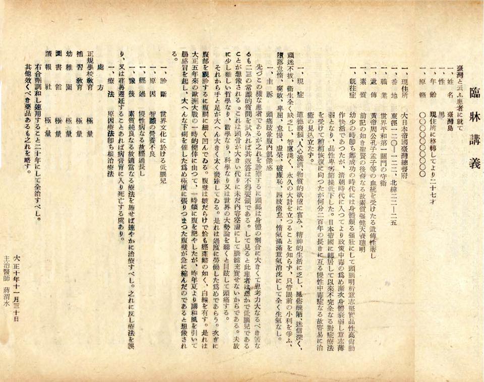 11月30日,他又用日文寫下〈臨床講義──對名叫台灣的患者的診斷〉,在該會第一號《會報》發表。根據蔣渭水的兒媳婦傅力力女士的中譯稿,他條例寫道,這個名為台灣的病人27歲(被日本殖民統治),原籍「中華民國福建省台灣道」,現住「大日本帝國台灣總督府」,職業是「世界和平第一關的守衛」。