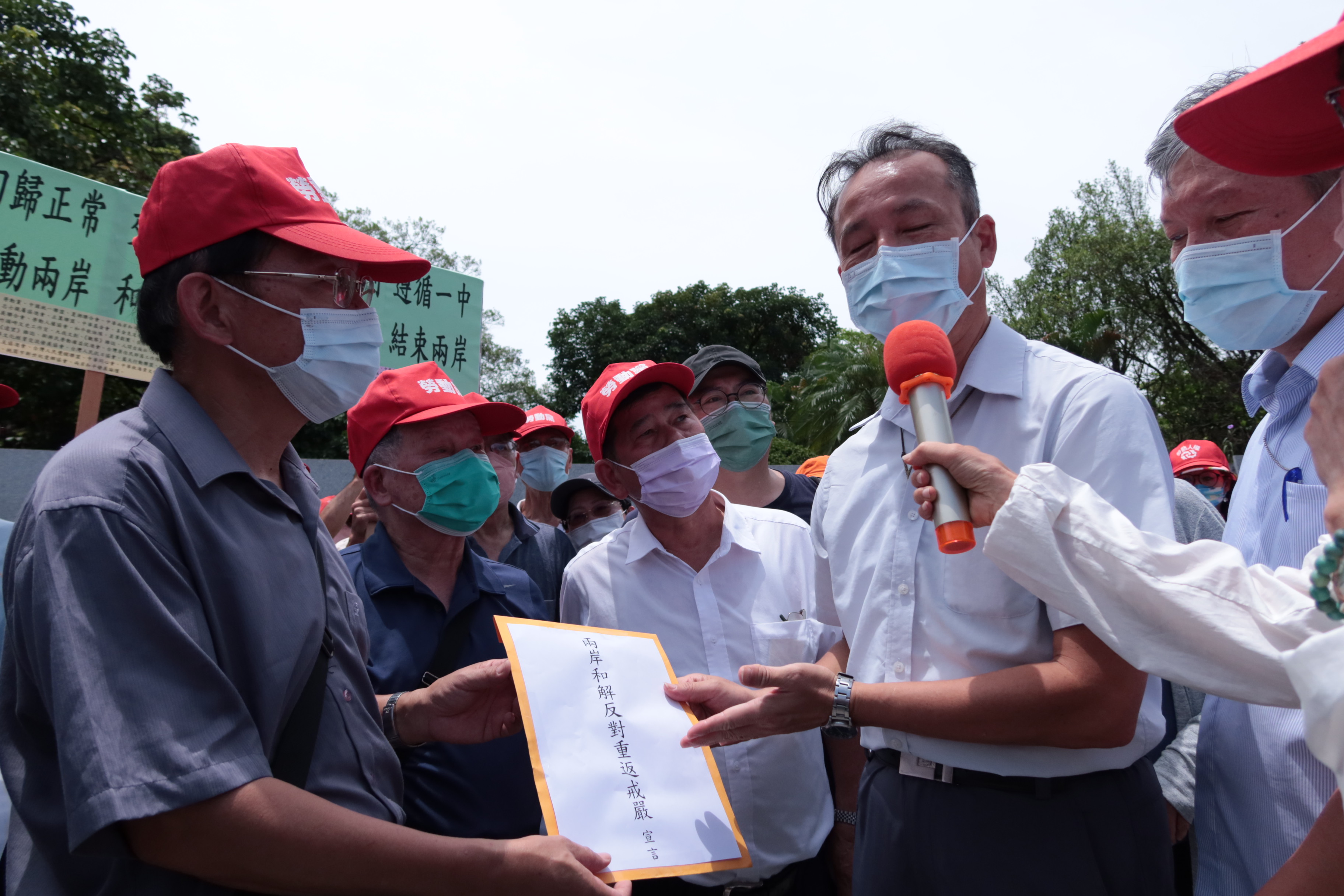 蔡英文辦公室公共事務室派員出來接受《呼籲兩岸和解,反對重返戒嚴》宣言聲明。圖片來源:台灣地區政治受難人互助會提供發起團體在宣言聲明中表示:罔顧兩岸關係的和平發展,就是走民主化的倒退路。兩岸關係只要一日不解除敵對狀態,就沒有真正的兩岸和平,就沒有真正意義上的解嚴!對此向民進黨當局提出三點呼籲: