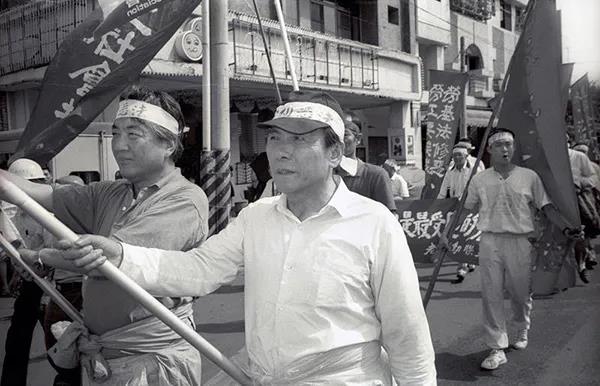 圖片左一為陳映真,中間舉旗者為林書揚。(圖片來源:兩岸犇報)